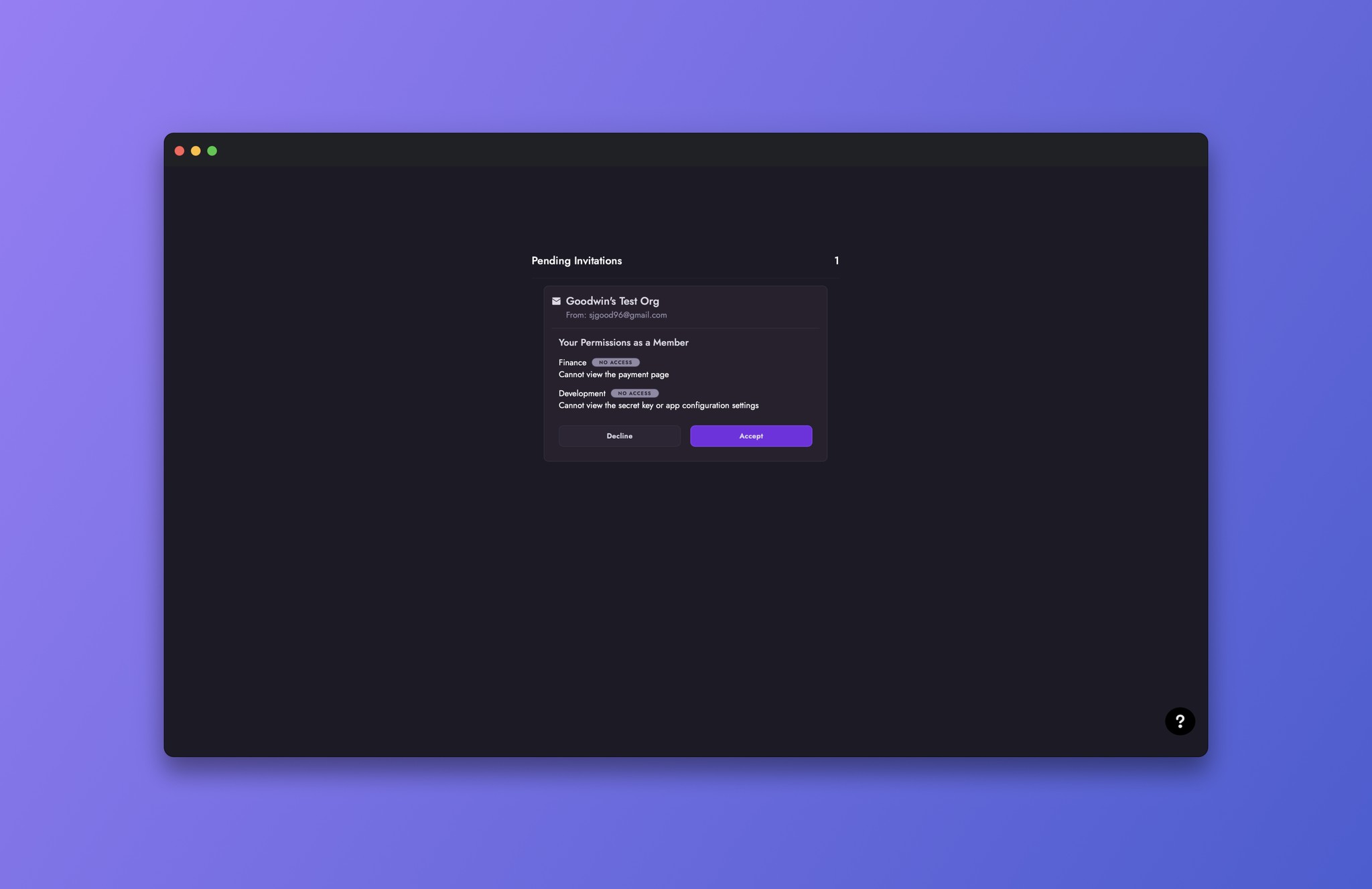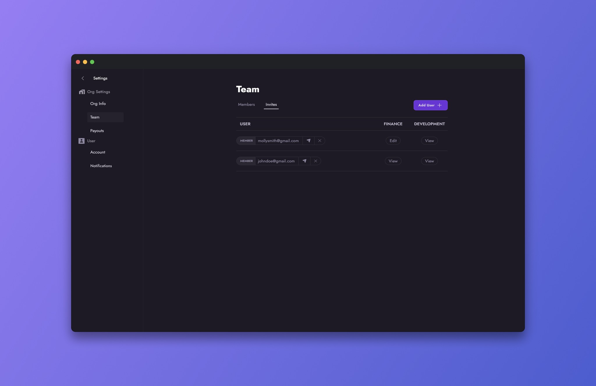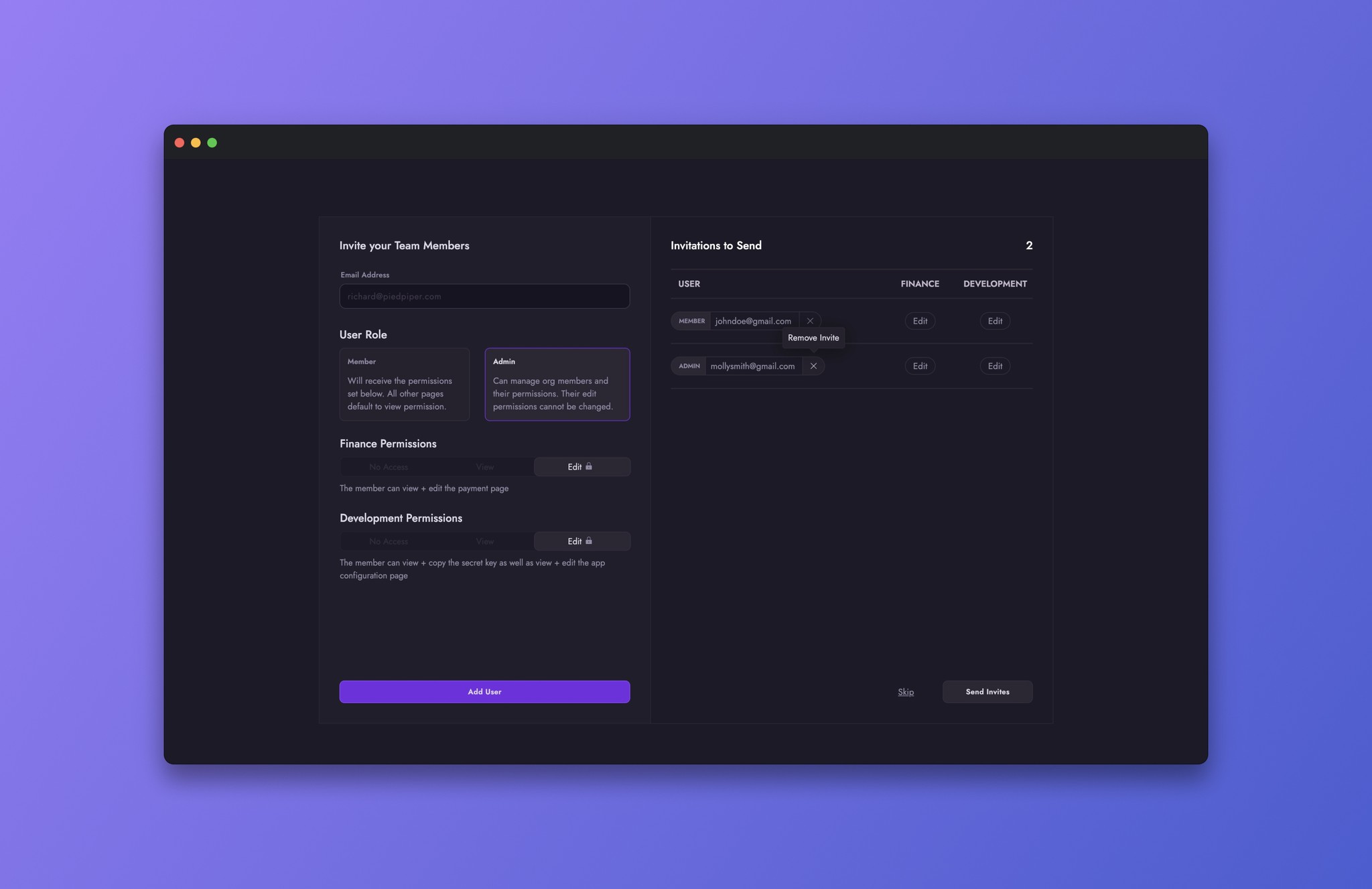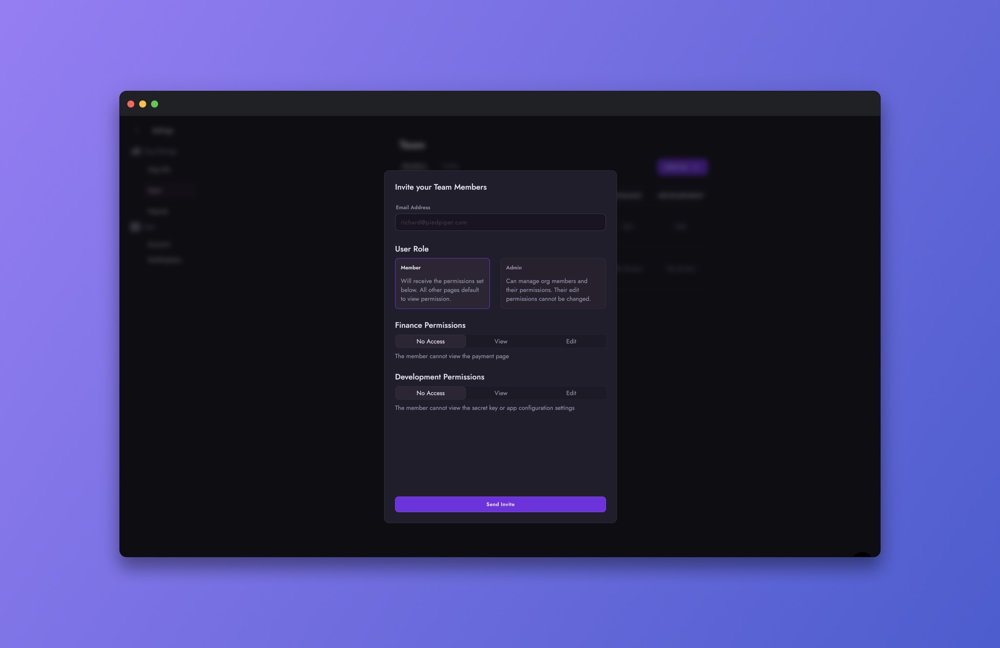 Enable users to securely invite Members and Admins to their Account, with customizable permissions for Finance and Development access.